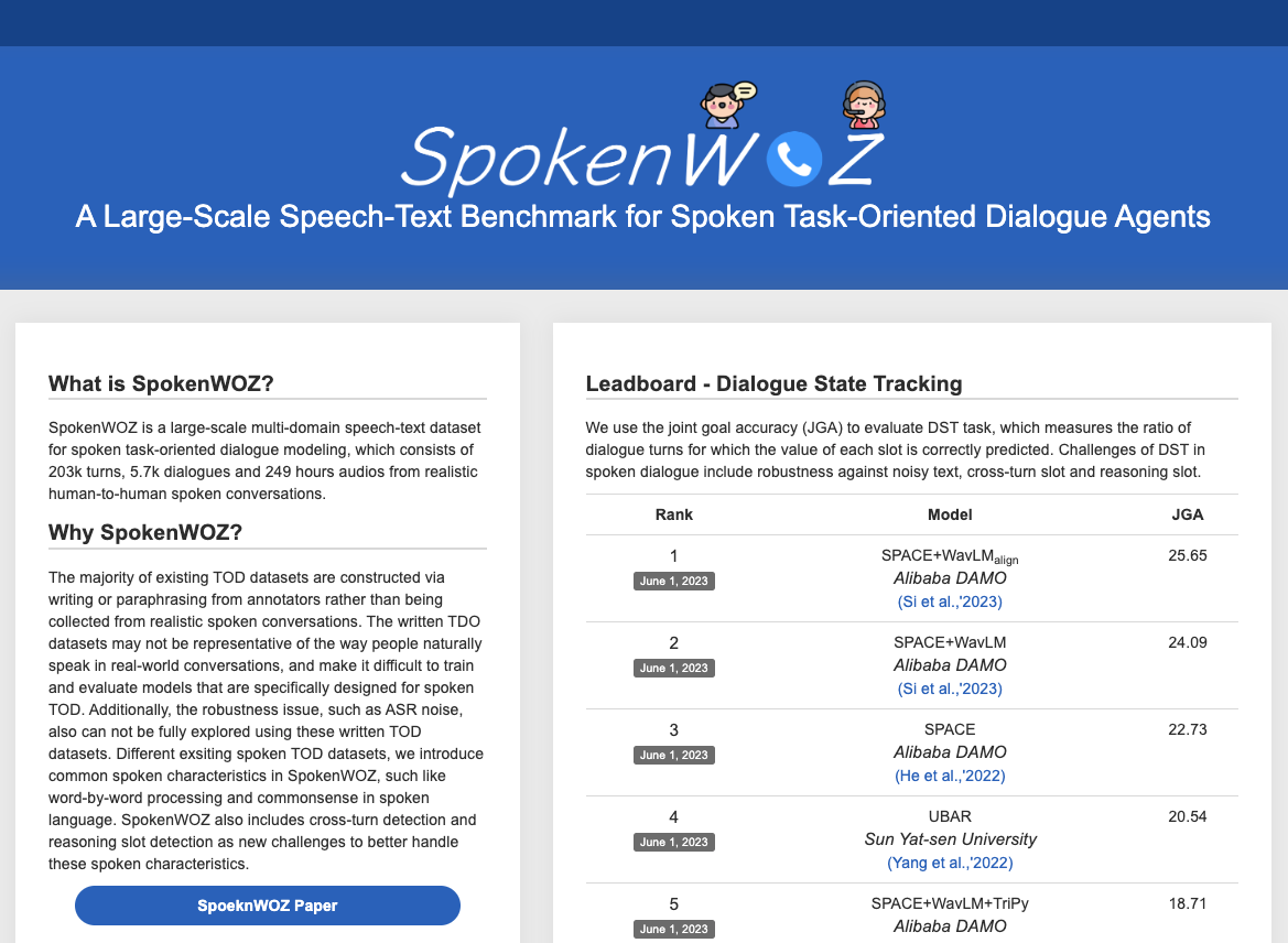 π Our papar SpokenWoz is accepted by NeuIPS 2023. A large-scale speech-text benchmark for spoken task-oriented dialogue agents.06/2023